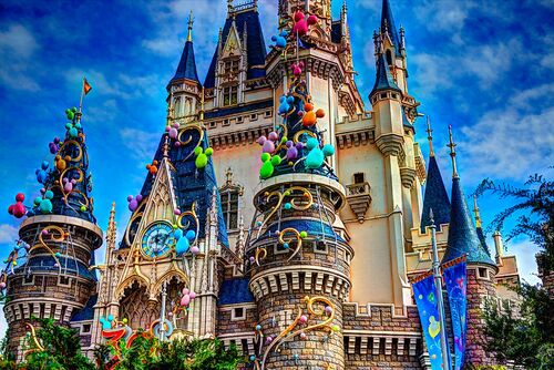 2013年、東京ディズニーランドが30周年を迎えた時のシンデレラ城です。三脚は使えないので一枚のRAW写真より複数毎の露出の写真を作成し、HDR化しています。 若干周辺光量落ちしているように見えます。Photomatixでの現像後にLightroomなんかで空の部分だけ…