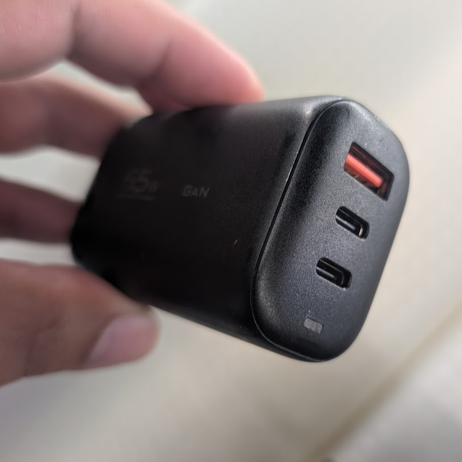 まずはこちらの充電器。だいたい1400円ぐらいで購入しました。 ノートPCの充電用として購入しましたが、USB-Cポートが2つ、USB-Aポートが1つついており、合計で65Wの出力に対応しています。