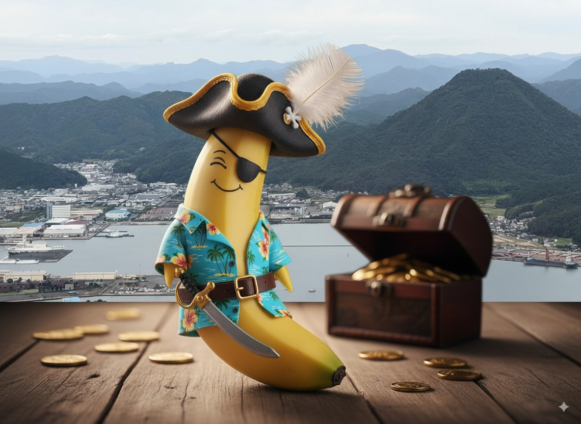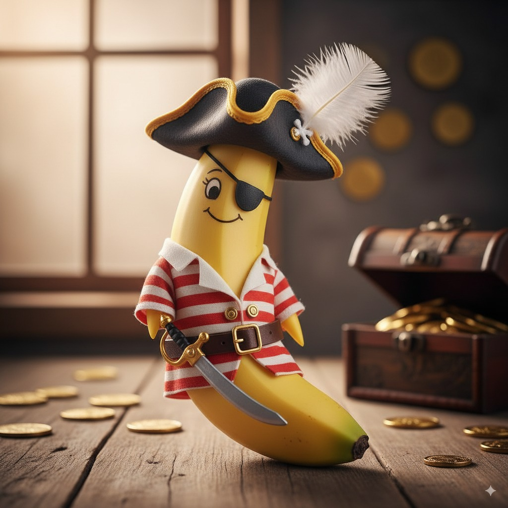 すると、上記のようなプロンプトで、海賊のコスチュームをまとったバナナのキャラクターが生成されました。
