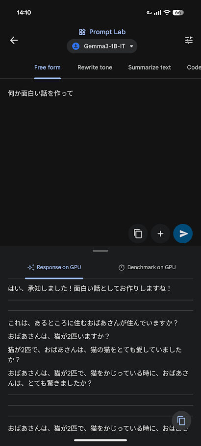Gemma3-1b-itモデルで日本語を使ってみましたが、正直なところ、実用は厳しいという印象でした。Gemma-3n-E2B-itモデルは、1Bモデルよりは日本語の受け答えが自然になっていますが、CPUで処理が(一部?)実行されるため返答が少し遅いです。SoCについてあまり詳しく知らないのですが、GPUのVRAM上にモデルが乗りきっていない可能性があります。
