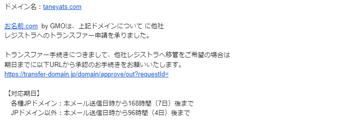 お名前.com側で申請を受け付けると、こんな感じのメールが飛んできますのでリンク先から承認を行います。