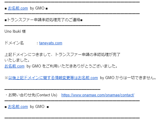 移管申請の承認を実行してから数十分後には移管処理が行われてGoogle Domainsの方で確認することができます。またお名前.comから処理完了のメールも届きます。