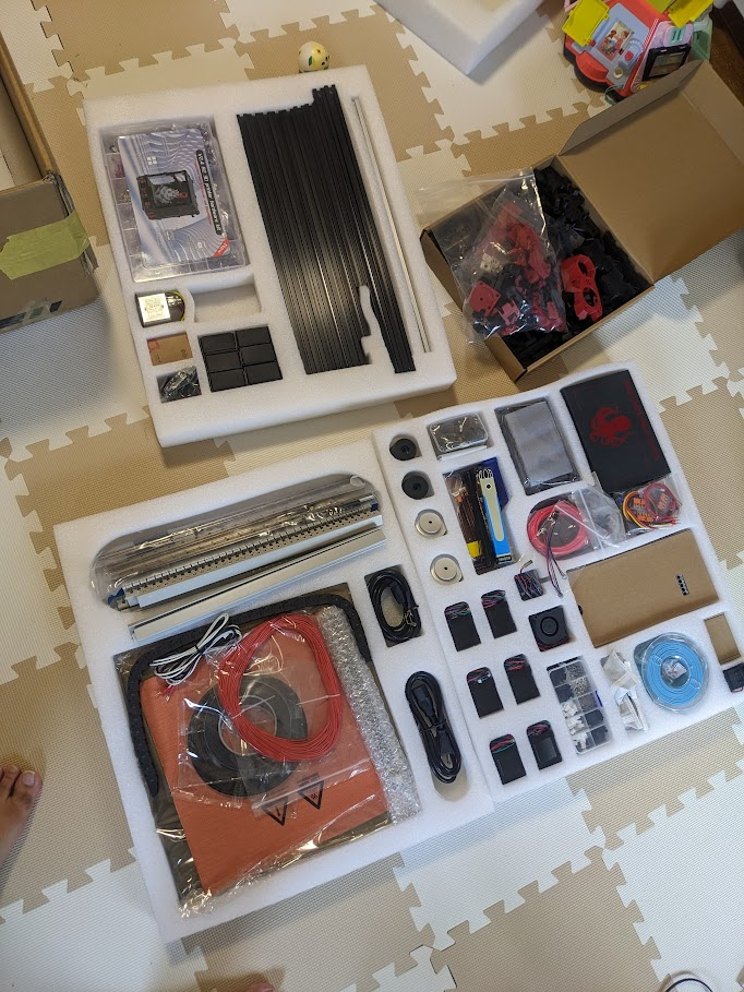 内容物はざっくりとこんな感じです。3段構造に分かれてキッチリと収まってました。3Dプリント部品は結構適当な感じで箱に入ってましたが破損などはなかったです。画像では見切れていますがエンクロージャーのアクリルプレートと底面のパネルもあります。