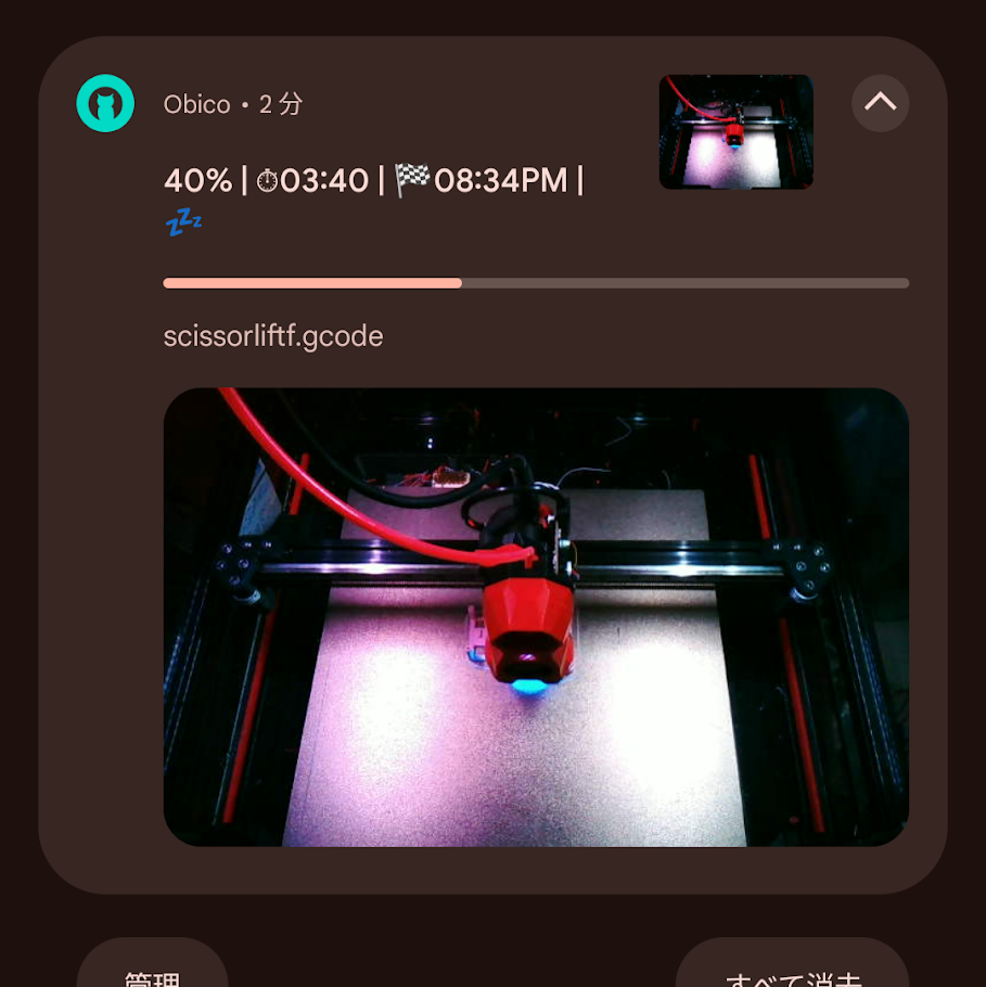 個人的に結構嬉しいのがプッシュ通知で印刷の終了を教えてくれることです。自分の場合はメインの作業場の背後にあるので音ですぐ完了がわかるのですが、外出時とかには便利ですね👀